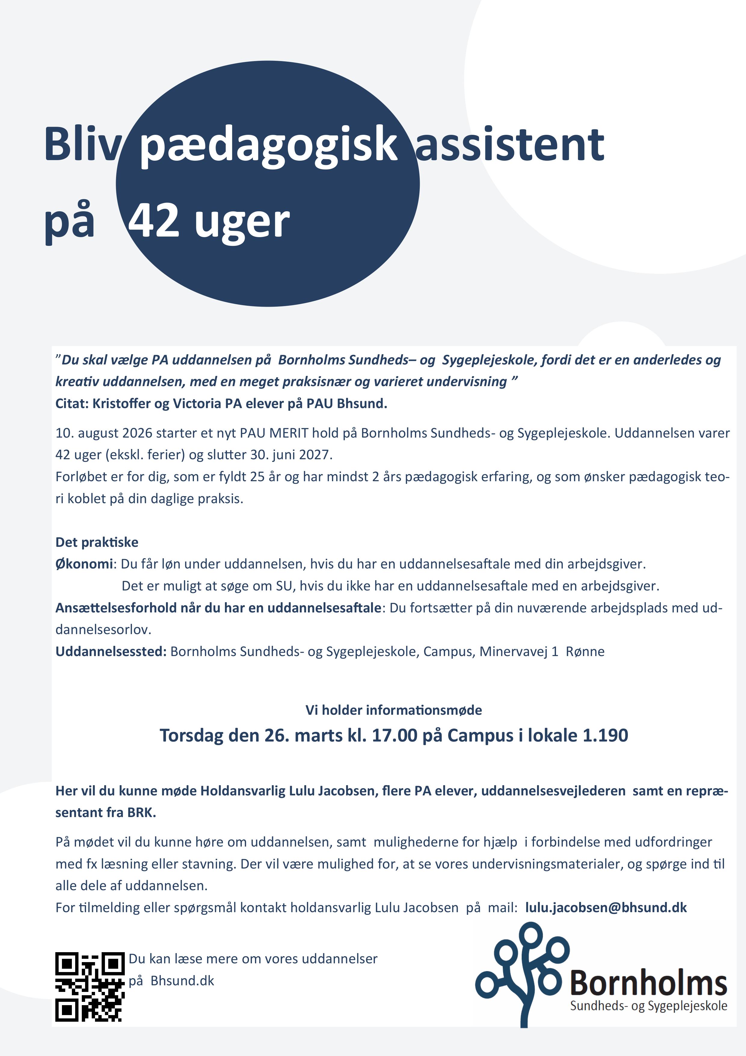 - august 2026 starter et nyt PAU MERIT hold på Bornholms Sundheds- og Sygeplejeskole. Uddannelsen varer 42 uger (ekskl. ferier) og slutter 30. juni 2027.